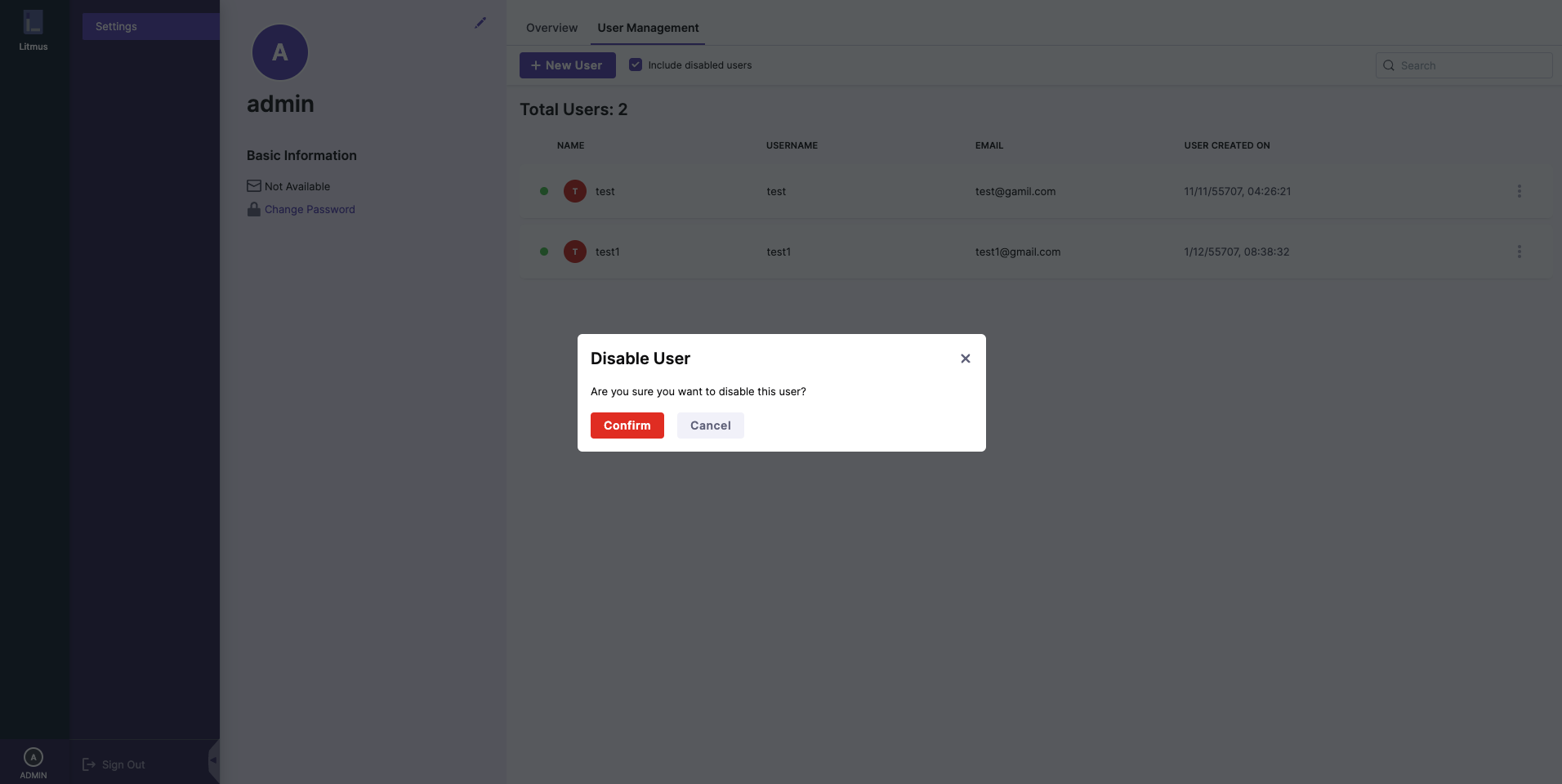 On clicking on the Disable User option, a confirmation prompt will pop up, click on the Confirm button in order to disable the user.